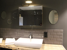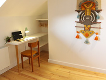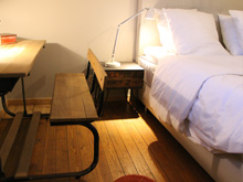 Souvenirs de voyage, plancher rustique et salle de bain lumineuse.