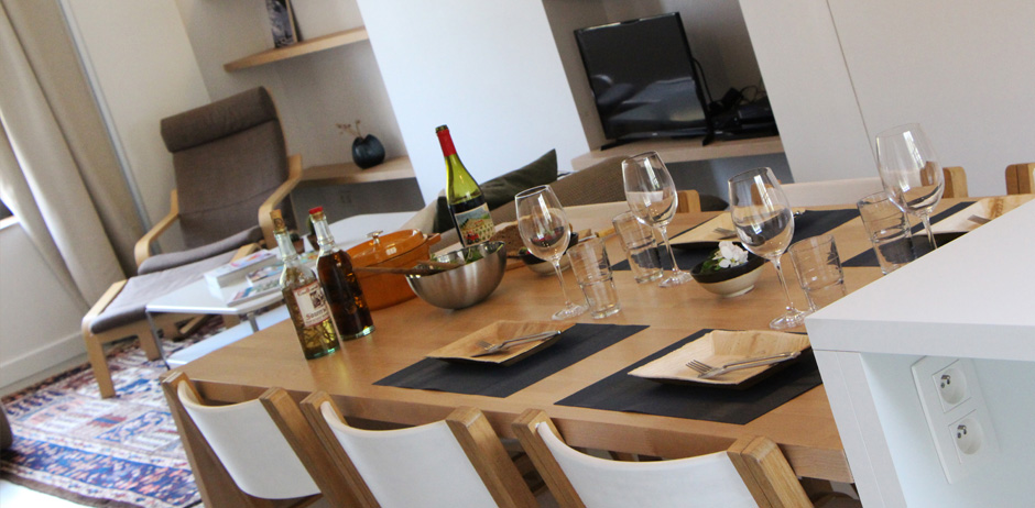 Machine Nespresso + percolateur, four micro-ondes, four traditionnel, table de cuisson vitrocéramique, double évier, ustensiles de cuisine, frigo avec congélateur, chaise haute pour enfant (sur demande), vaisselle, drap de vaisselle, produits ménagers
