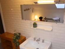 Souvenirs de voyage, plancher rustique et salle de bain lumineuse.
